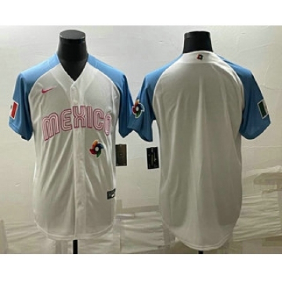 Men's Mexico Baseball Blank 2023 White Blue World Classic Stitched Jersey