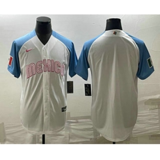Men's Mexico Baseball Blank 2023 White Blue World Classic Stitched Jerseys