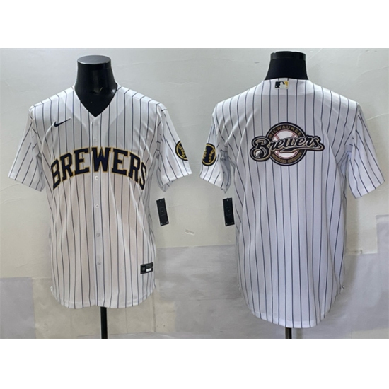 >Men's Milwaukee Brewers Team Big Logo White Pinstripe 2025 With Stitched Baseball Jersey