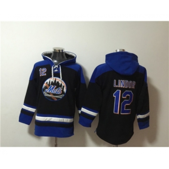 >Men's New York Mets #12 Francisco Lindor Black Blue Ageless Must-Have Lace-Up Pullover Hoodie