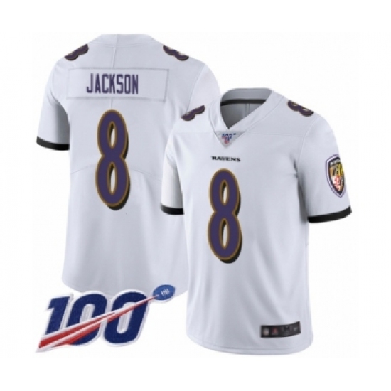 Men's Nike Baltimore Ravens #8 Lamar Jackson White Vapor Untouchable Limited Player 100th Season NFL Jersey