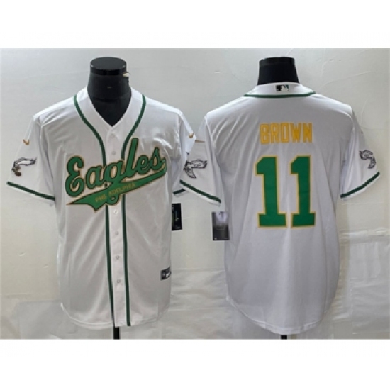 >Men's Nike Philadelphia Eagles #11 A. J. Brown White Gold Cool Base Baseball Stitched Jersey