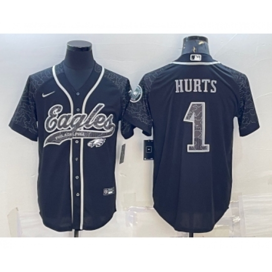 >Men's Philadelphia Eagles #1 Jalen Hurts Black Reflective With Patch Cool Base Stitched Baseball Jersey
