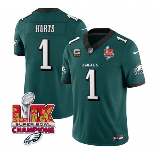 Men's Philadelphia Eagles #1 Jalen Hurts Green 2025 Eagles Logo Super Bowl LIX With 4-Star C New F.U.S.E. Vapor Untouchable Limited Football Stitched Jerse