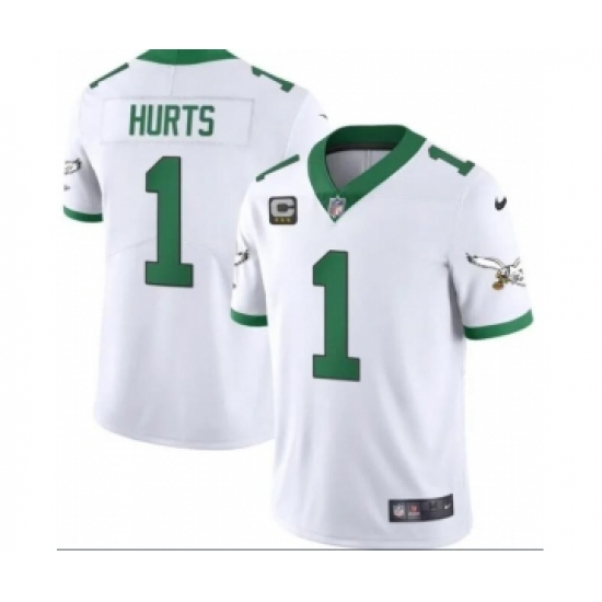 Men's Philadelphia Eagles #1 Jalen Hurts White Kelly Green With C Jersey