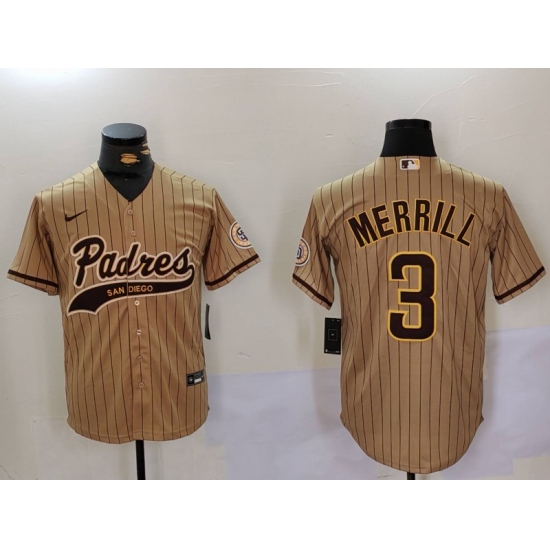 >Men's San Diego Padres #3 Jackson Merrill Tan 2023 Cool Base Stitched Jersey