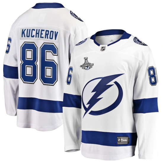 >Men's Tampa Bay Lightning #86 Nikita Kucherov Fanatics Branded White Away 2020 Stanley Cup Champions Breakaway Jersey