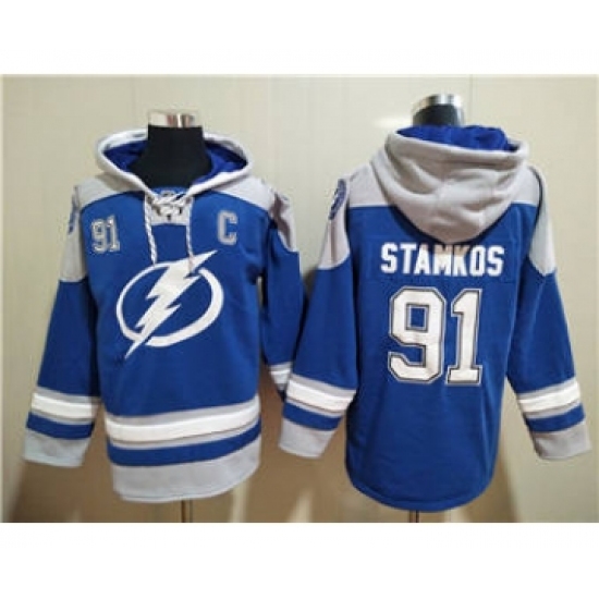 Men's Tampa Bay Lightning #91 Steven Stamkos Blue Ageless Must-Have Lace-Up Pullover Hockey Hoodie