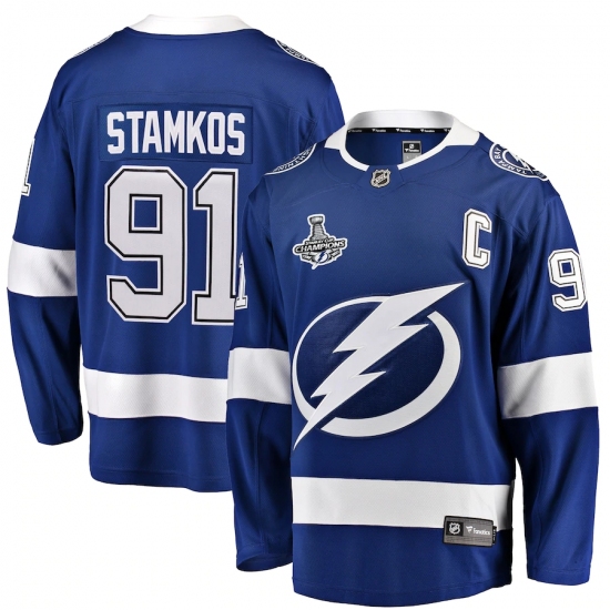 >Men's Tampa Bay Lightning #91 Steven Stamkos Fanatics Branded Blue Home 2020 Stanley Cup Champions Breakaway Jersey