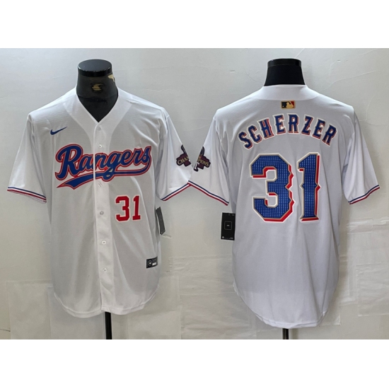 Men's Texas Rangers #31 Max Scherzer Number White 2023 World Series Champions Cool Base Jerseys