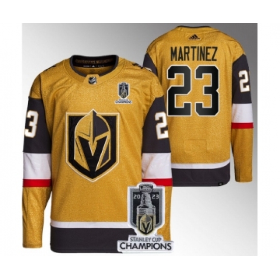 >Men's Vegas Golden Knights #23 Alec Martinez Gold 2023 Stanley Cup Champions Stitched Jersey