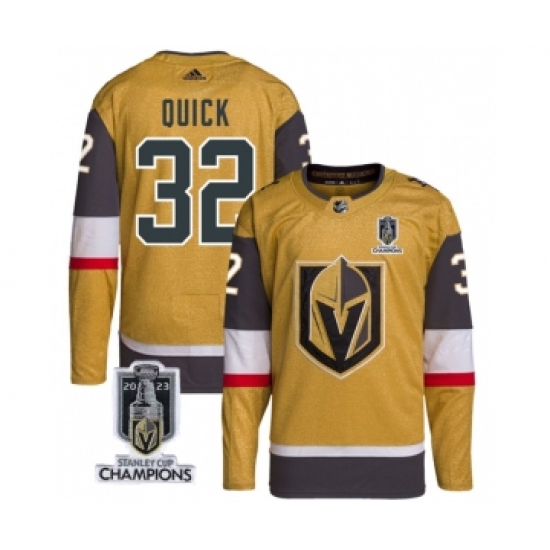 >Men's Vegas Golden Knights #32 Jonathan Quick Gold 2023 Stanley Cup Champions Stitched Jersey