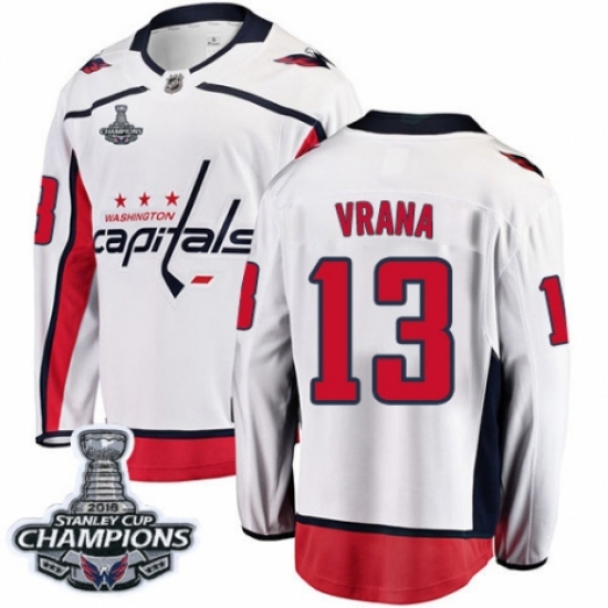 >Men's Washington Capitals #13 Jakub Vrana Fanatics Branded White Away Breakaway 2018 Stanley Cup Final Champions NHL Jersey