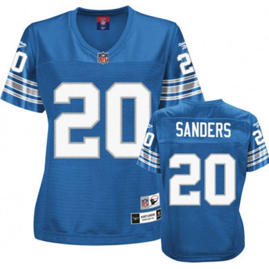 The high-quality Reebok Detroit Lions #20 Barry Sanders Blue Women's Throwback Team Color Premier EQT Throwback NFL Jersey is made of heavier fabric, with nylon diamond weave mesh. This team-colored jersey showcases the embroidered NFL® Equipment patch at the point on the v-neck collar and a team specific jock tag at the lower left front above the hem. The officially licensed Premier jersey proudly displays the sewn on, single-layer tackle twill team graphics at the chest, back and sleeves. Players name which is stiched shown at the upper back on a sewn down nameplate, The players number which 100% stitched is displayed in tackle twill on the chest, back and sleeves, NFL® Equipment jock tag shown at lower left front above the hem, Decorated in the team colors, Officially licensed.