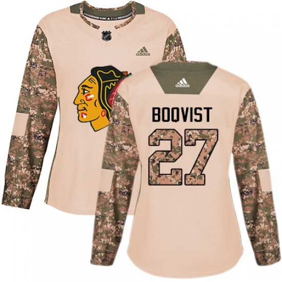 >Women's Adidas Chicago Blackhawks #27 Adam Boqvist Authentic Camo Veterans Day Practice NHL Jersey