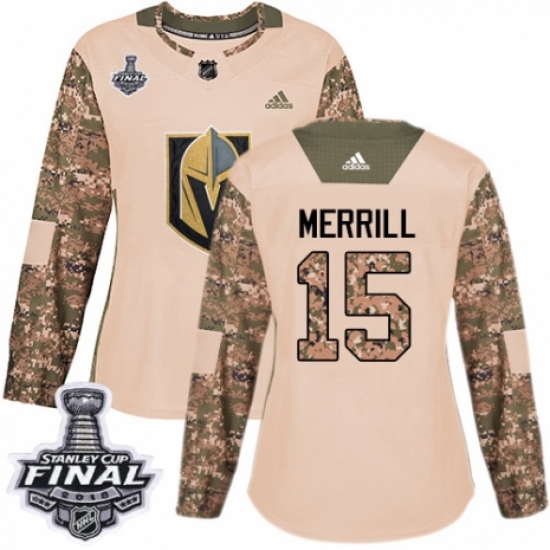 >Women's Adidas Vegas Golden Knights #15 Jon Merrill Authentic Camo Veterans Day Practice 2018 Stanley Cup Final NHL Jersey