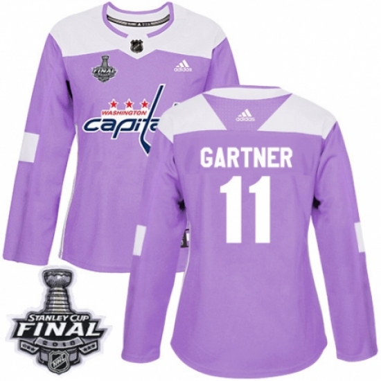 >Women's Adidas Washington Capitals #11 Mike Gartner Authentic Purple Fights Cancer Practice 2018 Stanley Cup Final NHL Jersey