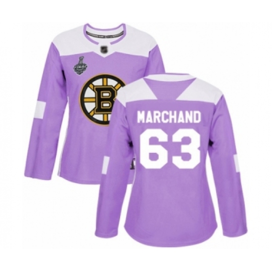 Women's Boston Bruins #63 Brad Marchand Authentic Purple Fights Cancer Practice 2019 Stanley Cup Final Bound Hockey Jersey