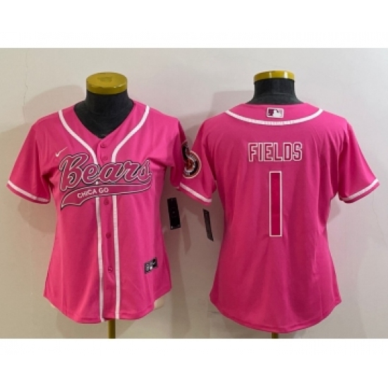 >Women's Chicago Bears #1 Justin Fields Pink With Patch Cool Base Stitched Baseball Jersey