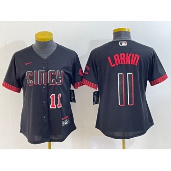 >Women's Cincinnati Reds #11 Barry Larkin Number Black 2023 City Connect Cool Base Stitched Jersey1