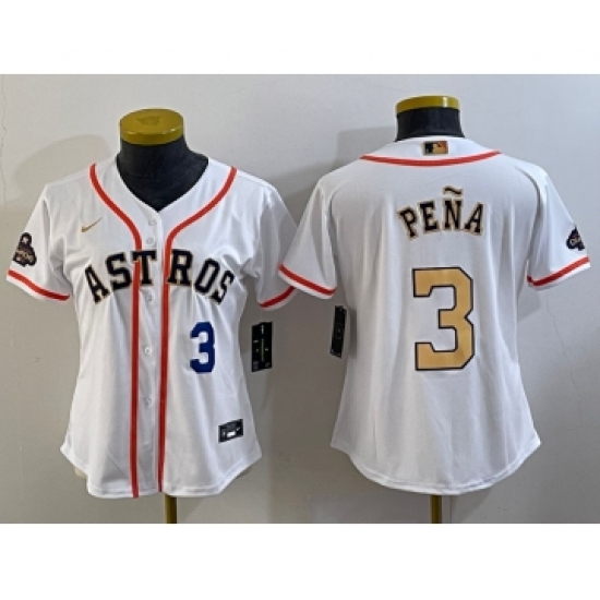 >Women's Houston Astros #3 Jeremy Pena Number 2023 White Gold World Serise Champions Cool Base Stitched Jersey1