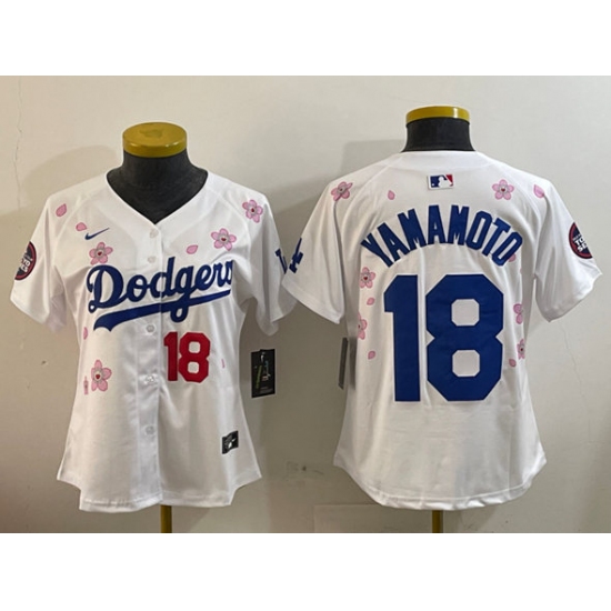 >Women's Los Angeles Dodgers #18 Yoshinobu Yamamoto White 2025 Tokyo Series Limited Stitched Baseball Jersey