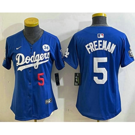 >Women's Los Angeles Dodgers #5 Freddie Freeman Number Blue 2024 World Series With Fernando 34 Limited Stitched Jersey