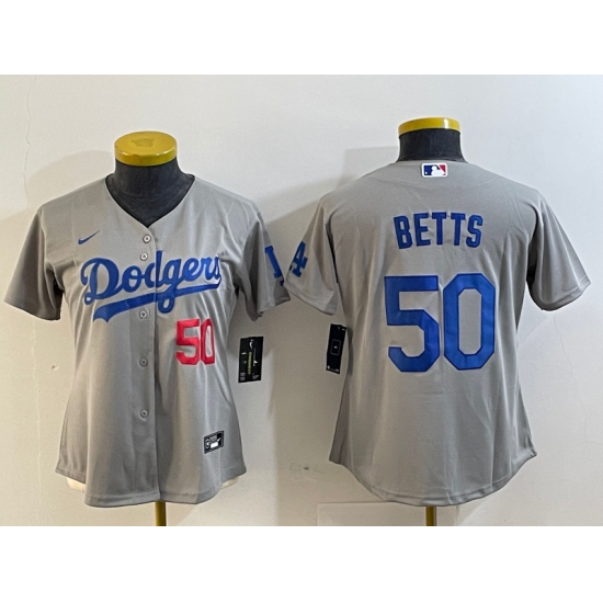 >Women's Los Angeles Dodgers #50 Mookie Betts Number Grey Cool Base Stitched Nike Jersey