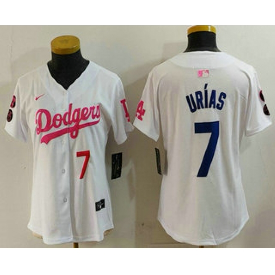 >Women's Los Angeles Dodgers #7 Julio Urias Number White Pink With Limited Stitched Jersey