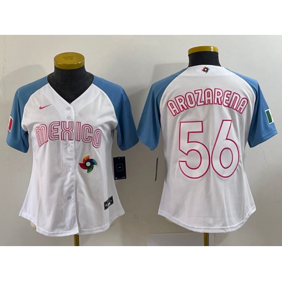 >Women's Mexico Baseball #56 Randy Arozarena 2023 White Blue World Classic Stitched Jersey1