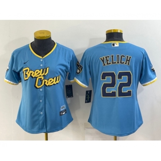 >Women's Milwaukee Brewers #22 Christian Yelich Blue 2022 City Connect Cool Base Stitched Jersey