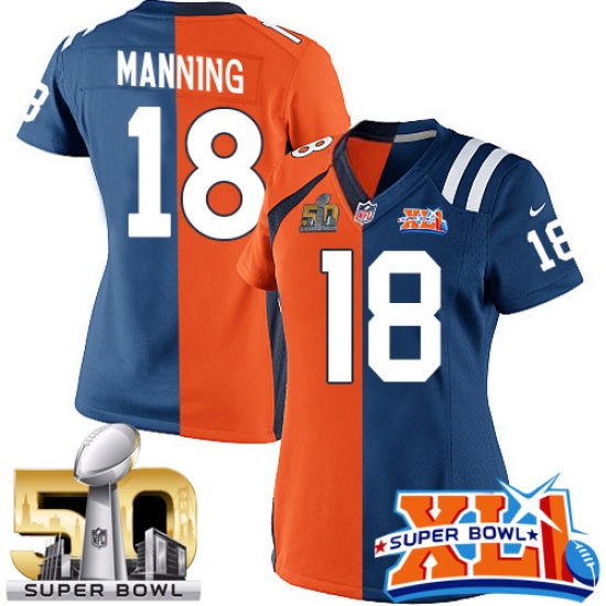 Home>NFL>Denver Broncos>Peyton Manning>Women's Nike Denver Broncos #18 Peyton Manning Limited Orange/Royal Blue Split Fashion Super Bowl L & Super Bowl XLI NFL Jersey