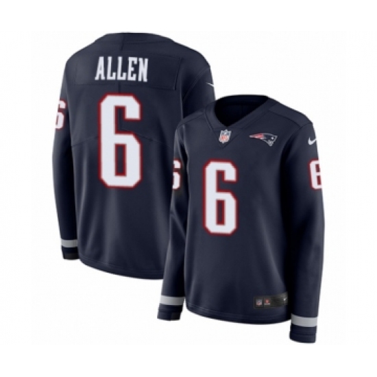 >Women's Nike New England Patriots #6 Ryan Allen Limited Navy Blue Therma Long Sleeve NFL Jersey
