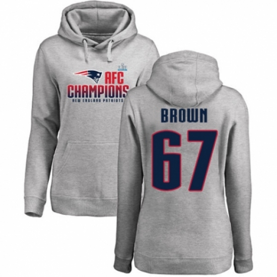 >Women's Nike New England Patriots #67 Trent Brown Heather Gray 2017 AFC Champions Pullover Hoodie