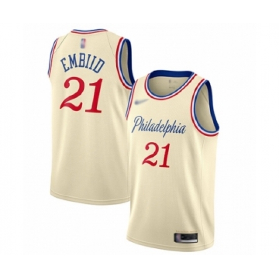 >Women's Philadelphia 76ers #21 Joel Embiid Swingman Cream Basketball Jersey - 2019 20 City Edition