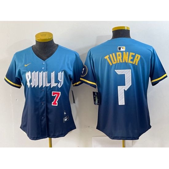 >Women's Philadelphia Phillies #7 Trea Turner Number Blue 2024 City Connect Limited Stitched Jersey