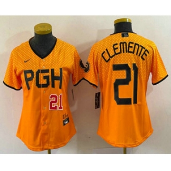 Women's Pittsburgh Pirates #21 Roberto Clemente Number Yellow 2023 City Connect Stitched Jersey2