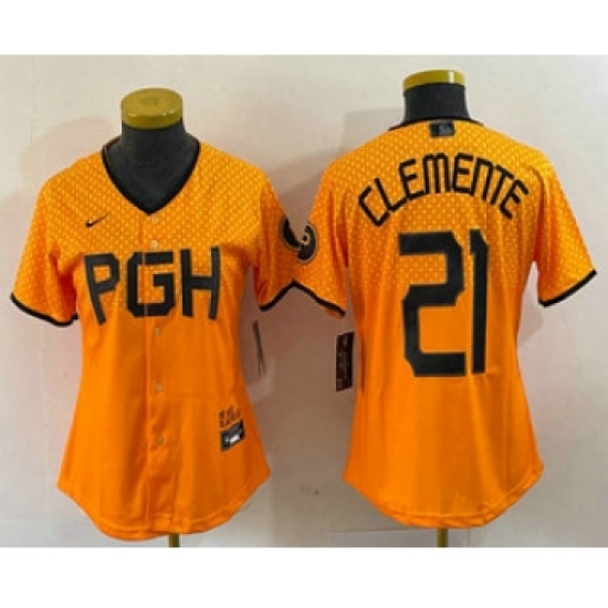 Women's Pittsburgh Pirates #21 Roberto Clemente Yellow 2023 City Connect Stitched Jersey
