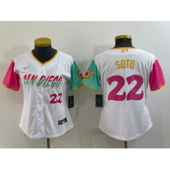 >Women's San Diego Padres #22 Juan Soto Number White 2022 City Connect Cool Base Stitched Jersey