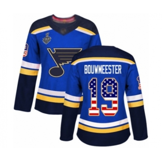 >Women's St. Louis Blues #19 Jay Bouwmeester Authentic Blue USA Flag Fashion 2019 Stanley Cup Final Bound Hockey Jersey