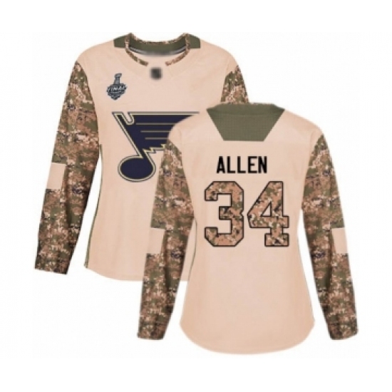 Women's St. Louis Blues #34 Jake Allen Authentic Camo Veterans Day Practice 2019 Stanley Cup Final Bound Hockey Jersey
