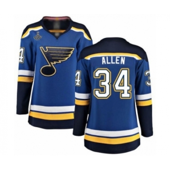 >Women's St. Louis Blues #34 Jake Allen Fanatics Branded Royal Blue Home Breakaway 2019 Stanley Cup Champions Hockey Jersey