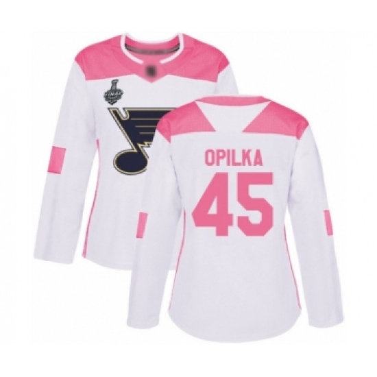 Women's St. Louis Blues #45 Luke Opilka Authentic White Pink Fashion 2019 Stanley Cup Final Bound Hockey Jersey