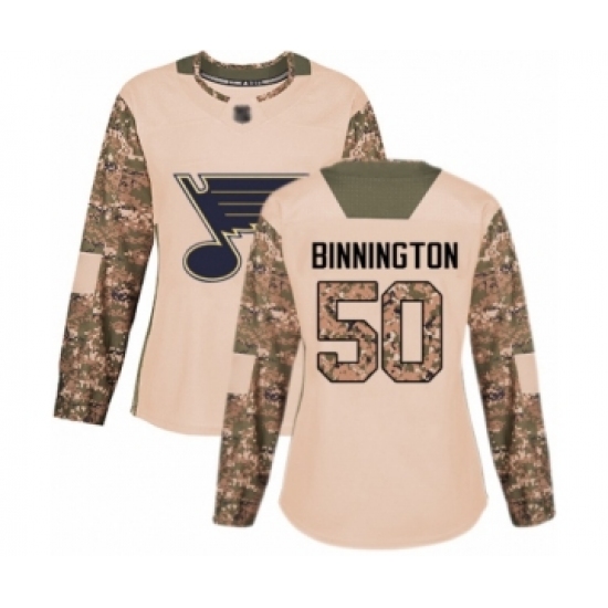 >Women's St. Louis Blues #50 Jordan Binnington Authentic Camo Veterans Day Practice Hockey Jersey