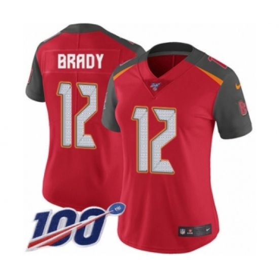 >Women's Tampa Bay Buccaneers #12 Tom Brady Red Team Color Vapor Untouchable Limited Player 100th Season Football Jersey