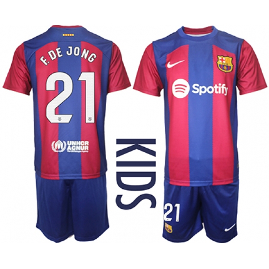 >Youth Barcelona #21 F.De Jong Blue Red 2023-24 Home Soccer Jersey