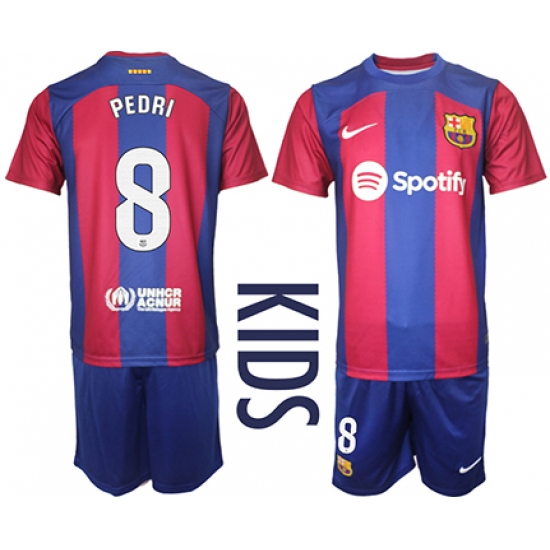 >Youth Barcelona #8 Pedri Blue Red 2023-24 Home Soccer Jersey