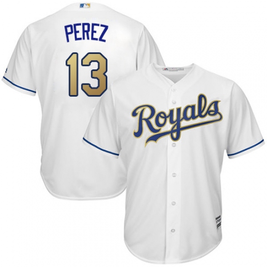 Home>MLB>Kansas City Royals>Salvador Perez>Youth Majestic Kansas City Royals #13 Salvador Perez Authentic White Home Cool Base MLB Jersey