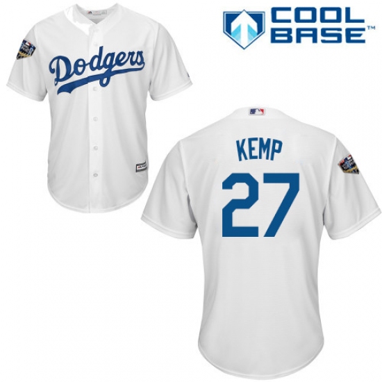>Youth Majestic Los Angeles Dodgers #27 Matt Kemp Authentic White Home Cool Base 2018 World Series MLB Jersey