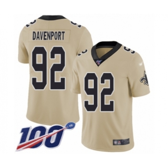 >Youth New Orleans Saints #92 Marcus Davenport Limited Gold Inverted Legend 100th Season Football Jersey